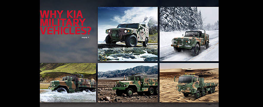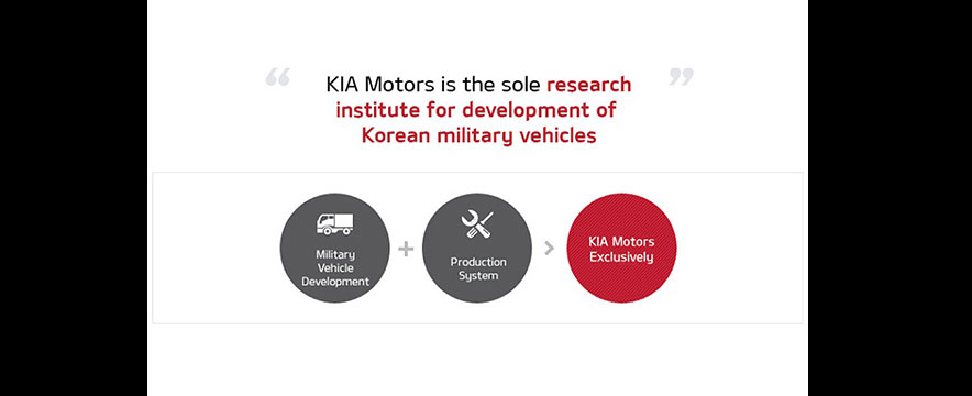 - Since being appointed as Korea�셲 defense industry company in 1973, Kia Motors has been fulfilling its role as the sole research institute for development of Korean military vehicles, along with operating its production systems. The company continues provide its top notch system guaranteeing maximum combat power sustained by various vehicle types that satisfy the requirements of military authorities, strategic experiences, and ideal logistics support. Moreover, as a popular automaker within its Hyundai Motors Group, Kia Motors proactively utilizes its basic infrastructure such as production facilities and standardization of edge-cut technologies applied to commercial passenger cars and its parts including engines/transmissions for improving overall competitiveness of military vehicles as well as reducing cost to make economical contribution to Korea�셲 national defense forces. Based on its recognized quality of its military vehicles, tried and tested by the military forces of Korea, Kia supplies vehicles to 20 foreign counties including the Philippines, Indonesia, and Chile. The company also makes local productions in foreign countries to support their industrialization, in cooperation with their governments. These situations help securing mutually beneficial military and diplomatic partnerships/relationships with those countries. Kia Motors will continue to commit its best efforts to make further advancement in development of military vehicles for the military forces of Korea, thereby improving mobilization of the military forces. With the innovative new products armed with high mobility and capabilities, as well as the creation of new market, Kia will claim its position as one of the world�셲 leading manufacturers by 2020. We cordially welcome your kind interest and support in Kia�셲 innovations and dramatic challenges for the future. We promise to lead the future Korean military mobilization systems with our advanced technologies. Thank you.